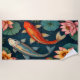 Ein farbenfrohes Paar Koi-Fische schwimmt zwischen Seerosen auf diesem schönen Strandtuch. Friedliche, ruhige Naturszene.
