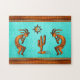 Genießen Sie dieses einzigartige Kokopelli Puzzle im Südwesten! Es hat zwei Kupfer Südwest Kokopelli Tanzen und spielen die Flute um einen Kaktus Unter der Sonne auf einem türkisfarbenen Hintergrund ...umgeben von einer Kupfergrenze! Dies ist ein Original Art Design von Künstler Kerry Miller.