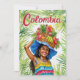 Auf dieser Postkarte befindet sich ein Aquarellportrait einer Frau in einem farbenfrohen Kleid, das einen Obstkorb auf ihrem Kopf mit dem Titel "Colombia" über ihr trägt.