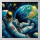 Ein einsamer Astronaut schwimmt im Weltraum vor dem lebendigen Hintergrund der Erde und zahlreicher Himmelskörper. Lebhafte Farben und komplexe Details erfassen die Weite und das Geheimnis des Universums.