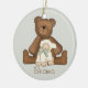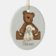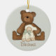 Erste Andenkenverzierung der heiligen Kommunion mit Teddybären und Lamm auf weichem grünem Hintergrund.