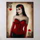 Pinup Stil Königin der Herzen Design mit Grunge-Effekte. Es zeigt eine schöne junge Frau, die ein rotes Korsett trägt, mit langen schwarzen Haaren.