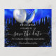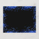 Schwarzer Hintergrund mit königsblauen Tropfen, Konfetti und Ballons. Personalisieren und fügen Sie Datum und Name/Alter hinzu. Der Text: Save the Date wird mit einem großen angesagten Handschrift geschrieben.