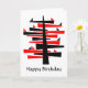 Ein abstrakter Baum in Rot und Schwarz mit kleinen Dreieckvögeln, die vielleicht im Morgengrauen singen. Zwei der Vögel, eine in Rot und eine in Schwarz, sitzen auf einem unteren Zweig. Aber natürlich ist die ganze Komposition wie eine Konversation in Form und Farbe. Der Baum ist vielleicht nicht anders als ein Zeder des Libanon. Laut dem sumerischen Epic von Gilgamesh wurden die Zedernwälder des Libanon als Wohnort der Götter angesehen. "Happy Birthday" vorne und innen (anpassbar) Eine kleinere Version des Hauptmotivs wird auch zur Dekoration des Innenraums verwendet.