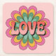Dieser Untersetzer zeigt eine groovy psychedelische Abbildung des Wortes LIEBE in einem Blume-ähnlichen Runddesign. Die Buchstaben sind in einem Gradienten von Korallen zu rosa. Die Buchstaben befinden sich in der Mitte einer großen Blume mit 12 Blütenblättern, die kreisförmig angeordnet sind. Die Blütenblätter sind in Rosa, Gelb und aquamarin grün gehalten. Das gesamte Design ist auf einem soliden, hellrosa Hintergrund. Die Blätter der Blume haben eine gekrümmte, fließende Form, die ein symmetrisches Muster um den Haupttext herum erzeugt. Die Illustration hat eine Vintage Ästhetik der 60er oder 70er Jahre mit niedlichen Farben und dekorativem Stil. Der Untersetzer ist ein Untersetzer aus Papierhalbstoff. Das Untersetzer-Set enthält sechs Untersetzer.