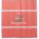 Korallenrote Farbe des eleganten Dekors irgendein Art-Zuhause-Duschvorhang. Familienstrandhaus oder irgendein Ferien-Zuhausemonogramm, aquamarine Farbmonogrammskriptinitiale mit weißer mutiger Typografie und Spitze/unteren Streifen. Benutzen Sie einfach die Funktion "personifizieren dieser Schablone", um Ihren Familiennamen einzufügen, Initiale und das hergestellte Datum und die Zuhauseart.