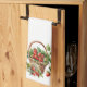 Ein Geschenk für Mama, ein Küchentuch mit einem Korb frischer Erdbeeren auf einem knusprigen weißen Hintergrund.