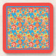 Ein Set mit 6 Untersetzer aus Korkgeflecht mit einem fröhlichen, orangefarbenen und gelben Blumenmuster auf einem hellen türkisfarbenen Hintergrund und einem hellen orangen Rahmen, der von Judy Adamson in einer handbemalten PapierCollage stammt.