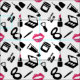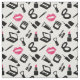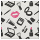 Stoffe mit einem Make-up-Muster in Rosa, Schwarz und Weiß mit Kosmetikprodukten wie Lippenstift, Mascara, Augape und vielem mehr.