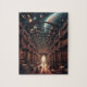 Eine traurige Illustration einer riesigen Bibliothek, die im Weltraum schwebt, Bücherregale, die sich in die Sterne hineinziehen und Wissen mit Wunder verbinden.