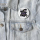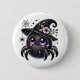 Eine flauschig schwarze Spinne mit einem scharfen Hexenhut, lila Augen und einem blumigen Akzent. Whimsischer Halloween-Charme für Kinder und Fantasy-Liebhaber, ideal auf Knöpfen und Streichhölzer.