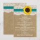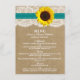 Die Kraft-, Spitzen- und Sonnenblumenkollektion ist ein atemberaubendes Design mit einem hübschen rustikalen Kraft-Papiereffekthintergrund mit einem romantischen Vintagen, weißen Spitzeneffekt-Trimm, der mit einer atemberaubenden Sonnenblume und einem aquamarinen Farbbandeffekt vollendet wird. Diese Menüs können für Ihren besondere Anlass personalisiert sein und würden die perfekte Vorlage für Hochzeitsmenüs, Brautparty-Menüs, Partnermenüs, Geburtstagsmenüs und vieles mehr machen. *Bitte beachten Sie, dass Zazzle nur gedruckte Produkte verkauft, sodass dieses Produkt keine echten Spitzen-, Sonnenblumen- oder Farbbandmaterialien enthält. ÜBERPRÜFEN SIE DIE ENTSPRECHENDEN ELEMENTE FÜR DIESE ERHEBUNG