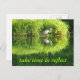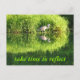 Der Kranich spiegelt sich im Wasser eines Teiches mit den leuchtenden grünen Farben oder Unkraut und Bäumen im Hintergrund wider. Die Wörter "Nehmen Sie sich Zeit zum Nachdenken" werden auf dem Punkt eingeprägt.