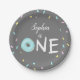 Geburtstagpapierplatte für ein Krapfenthema-Geburtstags-Party, das Krapfen mit tadelloser Glasur kennzeichnet. Der Text sagt, dass "EINER" mit einem Krapfen, der die Stelle für den Buchstaben "O." Sie ausfüllt, dieses Einzelteil besonders anfertigen kann, indem es den Namen Ihr Kindes an der Spitze addiert.
