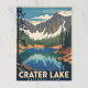Ein Vintages Reiseplakat für den Crater Lake National Park zeigt den tiefblauen See, der schneebedeckte Berge und Kiefernwälder unter einem klaren blauen Himmel reflektiert. Der "CRATER LAKE NATIONAL PARK" wird am unteren Rand kühn angezeigt.