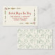 Teekarten für Kräutertee. Ecru-Farbe mit schlichter Randgestaltung, die kleine Teelöffel und Kräuterstämme und Blume umfasst. Dunkelrosa-roter Text ist im Skript für den Namen des Unternehmens und gedruckter Text für andere Informationen. Es gibt ein Muster von Teekannen und Teekannen auf der Rückseite.