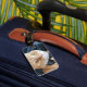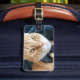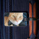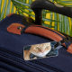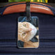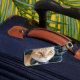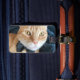 Ein selbstbewusstes junges Orange-Weiß-Tabby mit einer stilvollen Krawatte aus schwarzem Bogen hilft Ihnen, Ihr Gepäck freundlich zu finden.