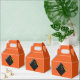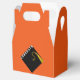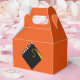 Graduation Party Gunst für den Absolvent mit Glückwünschen und schwarzen Graduierungsmütze mit goldener Tassel auf orangefarbenem Hintergrund.