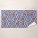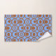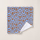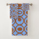 Dieses Handtuchhandtuch Set hat eine geometrische Form von Kreisen in Reihen mit Kreise oder Ovalen in Braun auf einem blauen Feld.