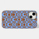 Dieses Handy Gehäuse hat eine geometrische Gestaltung von Kreisen in Reihen mit Kreisen oder Ovalen in braun auf einem Feld von blau.