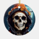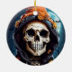 Ornament mit einer Abbildung eines Skeletts mit einer Kapuzenjacke mit einem orangefarbenen Hexenhut. Ein leuchtender Mond im Rücken mit einem Single-Fledermaus, der in der Nähe fliegt. Spaß Halloween Design.