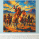Dieses lebhafte Ölgemälde erfasst eine dynamische Szene von amerikanischen Kriegern, die in den weiten Ebenen Pferde reiten. Der Anführer, der einen Speer verzweigt und eine auffallende gefederte Kopfhaut trägt, führt die Ladung mit Entschlossenheit und Zweck an. Die Gruppe durchquert eine sonnige Landschaft voller wirbelnder Wolken, pulsierendem Himmel und entfernter Berge, die das Gefühl der Bewegung und des offenen Raumes verstärkt. Die energischen Pinselstriche und die intensiven Farben vermitteln sowohl die Action als auch den Geist des Augenblicks und feiern die Verbindung zwischen den Fahrern, ihren Pferden und dem Land. Das Gemälde verkörpert die Tapferkeit, Einheit und die traditionellen Lebensweisen der Kulturen der amerikanischen Ureinwohner, was ein Gefühl von historischem Abenteuer und Gemeinschaftsarbeit hervorruft.