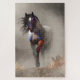 Irgendwo im amerikanischen Wilden Westen nähert sich ein mächtiges roan beschichtetes Kriegspferd, das rote und blaue amerikanische Kriegsfarbe trägt, dem Nebel. Seine dunkle Mähne und sein Schwanz blasen in den Winden der Prärie. Er ist direkt auf dich, den Betrachter, mit einem Blick auf die Entschlossenheit. Lass den Krieger besser aus dem Weg.