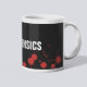 Schwarze Tasse mit benutzerdefiniertem Text "FORENSICS". Blutflecken. Anpassbare Hintergrundfarbe.