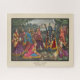 20" x 16" Puzzle aus West Bengalisch, Kalkutta 1878-1883. In diesem seltsamen Thema erscheint Krishna in der Gestalt Kalis - vier bewaffnet, in makabre Garlands und mit vorspringender roter Zunge - und wird von seinem [geheimen] Liebhaber Radha geehrt, der von anderen coword maidens (gopis) des Yadavas-Clans in einer Waldverglasung gesehen wird. Krishnas wirkliche Identität wird dennoch durch die Pfauenelemente, die er in seinem Diadem trägt, angedeutet, ganz zu schweigen von seiner unnachgiebigen Pose. Die Geschichte erzählt, dass Radhas Ehemann von ihrer Verbundenheit mit Krishna hört und eilt, sich ihrem Geliebten entgegenzustellen, aber bevor er ankommt (er wird durch die Einfahrt nach oben rechts betrachtet), verwandelt sich Krishna in Kali und weist Radha an, sich so zu verhalten, als ob er eine Puja (rituelle Anbetung) darstellend hätte. Der wütende Ehemann wird von diesem Trick getäuscht und bewegt, von der Frömmigkeit seiner Ehefrau zu hören, die Familiengott zu verehren. Die Komposition und der Rahmen sind alle charakteristisch für ein Set der Viktorianischen Bühne, mit malerischem Landschaftsbild. Sehen Sie sich die gesamte Erleuchtung Puzzle-Sammlung in AKTIVITÄTEN an. | Abschnitt "Rätsel".