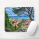 Aussicht auf die kleine Stadt Omis, umgeben von Bergen, Cetina Fluss und Meer, Makarska Riviera, Kroatien. Aussicht auf Kiefernwald, Altstadt mit roten Dächern und blauem Blick.
