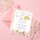 "Eine süße kleine Prinzessin ist auf ihrem Weg" "Baby Shower" Design mit Gradientenungleichschrift für "Prinzessin" mit einem Imitat Gold Glitzer Tiara Kronen, rosa Gradienten Schmetterlinge und auf den unteren Imitaten Gold Glitzer betont rosa Rosa Blumenrahmen. Füge einfach die Duschdetails hinzu, um das Design zu vervollständigen.