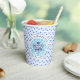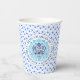 Blaue Papiertassen mit dem offiziellen KrönungsEmblem von König Charles III. 2023