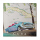 Illustrierte Karte von Kuba (mit den umliegenden Inseln) in einem Vintagen, detaillierten Stil mit einem klassischen alten Kubanauto bei Sonnenuntergang.