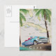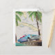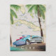 Illustrierte Karte von Kuba (mit den umliegenden Inseln) in einem Vintagen, detaillierten Stil mit einem klassischen alten Kubanauto bei Sonnenuntergang.