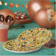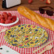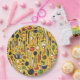 Künstliches und humorvolles Foto eines Tellers mit Küchenutensilien, Obst und Gemüse.