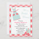 Eine Spaßküchen-Brautpartyeinladung mit blauer und weißer Polkapunkt-Schürze, den Küchengeräten gebunden mit einem rosa Bogen und rosa und weißer Ginghamgrenze. Grafiken © http://myclipartstore.com