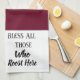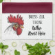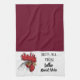"Segen all derer, die hier verwurzelt sind" ist die Beschriftung auf diesem Burgund und Weiß Küchentuch mit einem weißen und roten Hühnerkopf. Passen Sie dieses Objekt an oder kaufen Sie es wie gezeigt. Börsenbild freepik.com