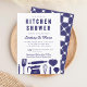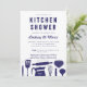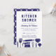 Geschirr, eine Kaffeekanne und ein Topfhalter schmücken diese Duscheinladung in der Küche. "Küchendusche" hat einen gebeutelten Blick mit Retro-Schriftart für den Namen der Braut und Registrierungsdetails.