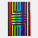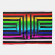 Regenbogenstreifen verlaufen senkrecht, schwarze Streifen trennen die Farben. In der Mitte befindet sich ein Kreis, in dem die schwarzen Streifen in horizontaler Farbe verändert werden und die mittleren Regenbogenfarben einen eher verschwommenen Effekt haben.