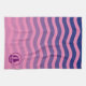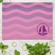 Fügen Sie Ihr Monogramm zu diesem nautischen Küchentuch mit einem lila Segelboot auf blauen und rosa Wellen. Ideal für Picknick und Fischessen am Meer.
