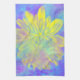 Küchenhandtuch mit großer gelber Blume und aquamarinem Hintergrund.