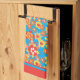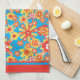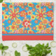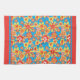 Ein Küchentuch oder ein Teetuch, mit einem fröhlichen Gesamtbild von roten, orangefarbenen und gelben Blumen auf einem hellen, türkisfarbenen Hintergrund, von Judy Adamson in einer handbemalten Papiertüte.