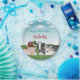 Desteis originelle Cartoon-Abbildung von Nutztieren. Es gibt eine schwarz-weiße Kuh, ein rosa Schwein, zwei Hühner und ein Schaf. Im Hintergrund befindet sich eine rote Scheune mit einem Baum und etwas Heu auf grünen Wiesen. Der Himmel ist blau mit ein paar Wolken. Es gibt auch zwei personalisierbare Textbereiche.