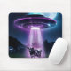 Die geheimnisvolle Szene eines UFO, das eine Kuh in einem Lichtstrahl vor der Kulisse eines Nachthimmels mit Vollmond anhebt. Perfekte Illustration für Fans von Science Fiction und fantastische Geschichten über den Kontakt mit außerirdischen Zivilisationen.