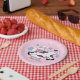 Der niedliche PapierTeller, der eine Polka kennzeichnet, punktierte die Kuh, die über den Mond mit glücklichen lächelnden blauen Sternen springt. Funkelnder Sternhintergrund. Personifizieren Sie ihn mit kundengerechter Text- und Hintergrundfarbe. Vervollkommnen Sie für eine Babyparty. PinkInkArt Vorlage!