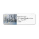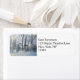 Eine wunderschöne Landschaft in der Winterzeit. Im Vordergrund dieses Fotos stehen Zweige weißer Blüten, vielleicht Apfelblüten, mit nackten Bäumen und ein paar Kühen in der Ferne, die auf dem kalten, schneebedeckten Boden in einem winterlichen Feld weiden.