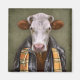 Dieses Design zeigt ein Portrait einer Kuh in einer Lederjacke und Schal.