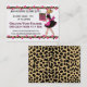 Dieses Ausrüstungsbeschreibungen ein Retro-inspiriertes Mädchen, das sehr Plüschleoparddruck und rosa Tücher trägt. Drucklinie mit zwei Leoparden mit rosa Tupfen schließt den Blick ab. Die Rückseite dieser Karte kennzeichnet den gleichen Leoparddruck. Personifizieren Sie den Text auf dieser zeitgenössischen Visitenkarte und Sie sind bereit zu gehen!