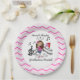 Ein Strichmännchenmädchen-Violinenspieler in einem rosa Kleid auf rosa Zickzack Entwurfspapier-Teller. Kundenantrag