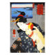 Kuniyoshi Frau mit Katzenprint. Ukiyo-e aus der Edo Periode Japan. In Utagawa Kuniyoshi wurden Katzen häufig in seinen Ukiyo-e-Holzschnitt-Drucken vorgestellt. Eine Frau mit einer Katze zeigt eine japanische Frau in traditionellem Kleid aus der Edo-Zeit des 19. Jahrhunderts mit einer großen weißen und cremefarbenen Katze. Hinter ihr steht ein Gemälde eines Fischers, der einen riesigen Oktopus auf dem Ozean bekämpft und zwei rote Embleme mit japanischem Kanji. Ein hübsches Geschenk für Fans von Utagawa Kuniyoshi, japanischen Kunstwerken und Katzenmalereien.